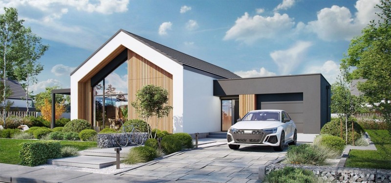 Гараж на одно авто и котельная с функцией кладовой запроектированы под плоскую кровлю. Основной жилой блок с двухскатной кровлей. Две детские, ванная и мастер-спальня с гардеробной расположены вдали от просторной кухни-гостиной, которую освещается высокий витраж со вторым светом.
