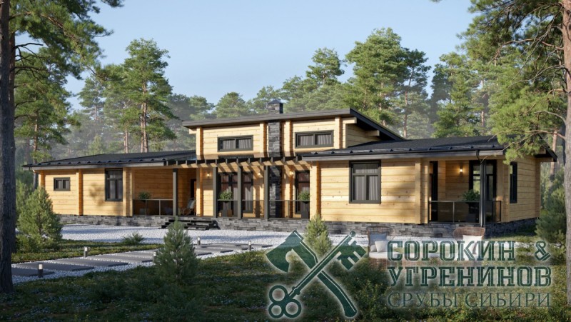 Индивидуальный проект одноэтажного жилого дома из лафета сечением 250х400мм. Общая площадь дома 371м2, размер сруба 15х31м. Большой дом в Европейском стиле, имеет четыре спальные комнаты, три санузла, кабинет, прихожая, гостиная, кухня, два выхода на террасы, гардеробная, котельная, большая гостиная с камином, прачечная, кладовая, и гараж.